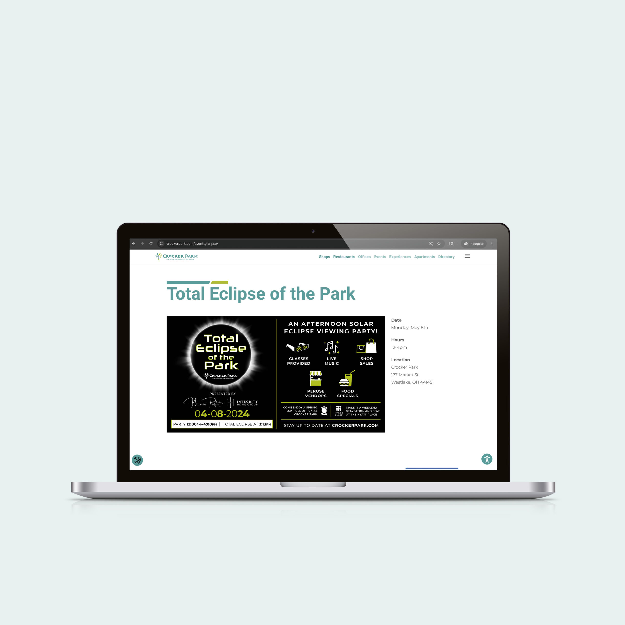 Branding for Total Eclipse of the Park, a once-in-a-lifetime event to witness the total eclipse in Northeast Ohio in 2024. This included printed property signage, digital property signage and website graphics.