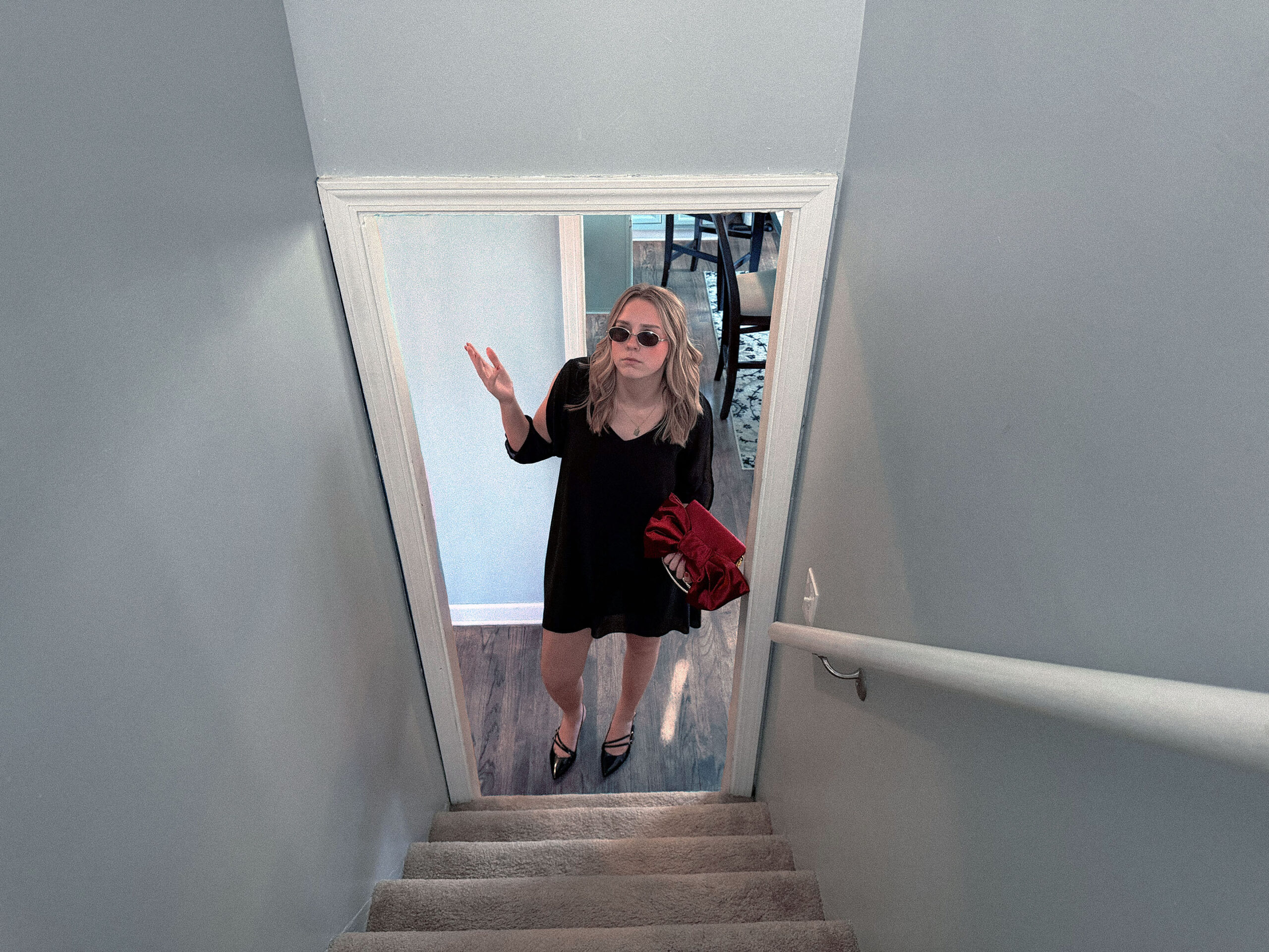 This series explores the feeling of being all dressed up and waiting for a partner who isn’t ready. Cool-toned editing and thoughtful composition amplify the sense of frustration and distance, while the vibrant red bow purse pops as a bold, emotional focal point, creating a striking contrast that tells the story visually.